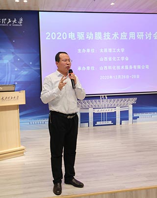 2020 年12月 26日-28日2020 电驱动膜技术应用研讨会在太原理工大学科技产业孵化园召开,本次会议由太原理工大学、山西省化工学会-膜技术应用专业委员会主办,山西科化技术服务有限公司承办。来自清华大学、天津工业大学、南开大学、大连理工大学、大连海事大学、河北工业大学、南京理工大学、中科院青海盐湖所、太原理工大学、山西大学、中国辐射与防护研究院、山西省应用化学研究所、山西省中医药大学、中国化工报社、山西省华侨基金会及山西省化工学会水处理专业委员会,膜技术行业研发、生产、应用的企业界和风险投资机构的39位专家学者和67位研究生,共106人参加了现场会议交流。因疫情防控原因,部分专家通过网络做了报告和进行了交流。